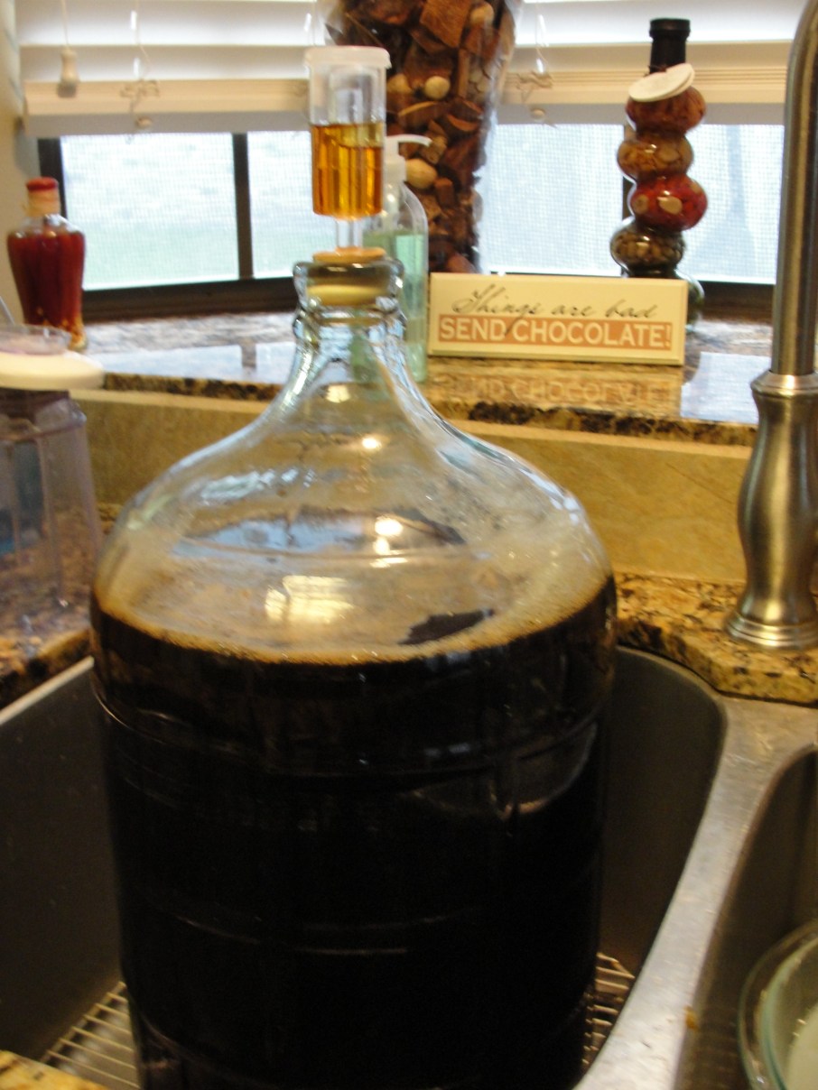DSC01918 Published September 14, 2012 at 2736 × 3648 in Bourbon and Oak Infused Imperial Stout 5 gallons of my Imperial Stout, boubon infused and toasted oak resting on the bottom. Note the bourbon in the airlock! Post a comment or leave a trackback: Trackback URL.