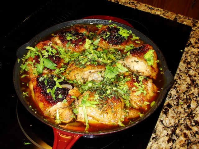 I will have to admit that I altered the recipe just a bit…The ingredients for the rub were not sufficient to coat the 8 chicken thighs. I am also of the opinion that the size of the chicken thighs Better Homes and Garden had in mind for the recipe do not match the offerings found in my local Texas supermarket. The 8 thighs I purchased weighed in at 6.8 pounds! I have a large deep sided skillet and it was full to the brim!
