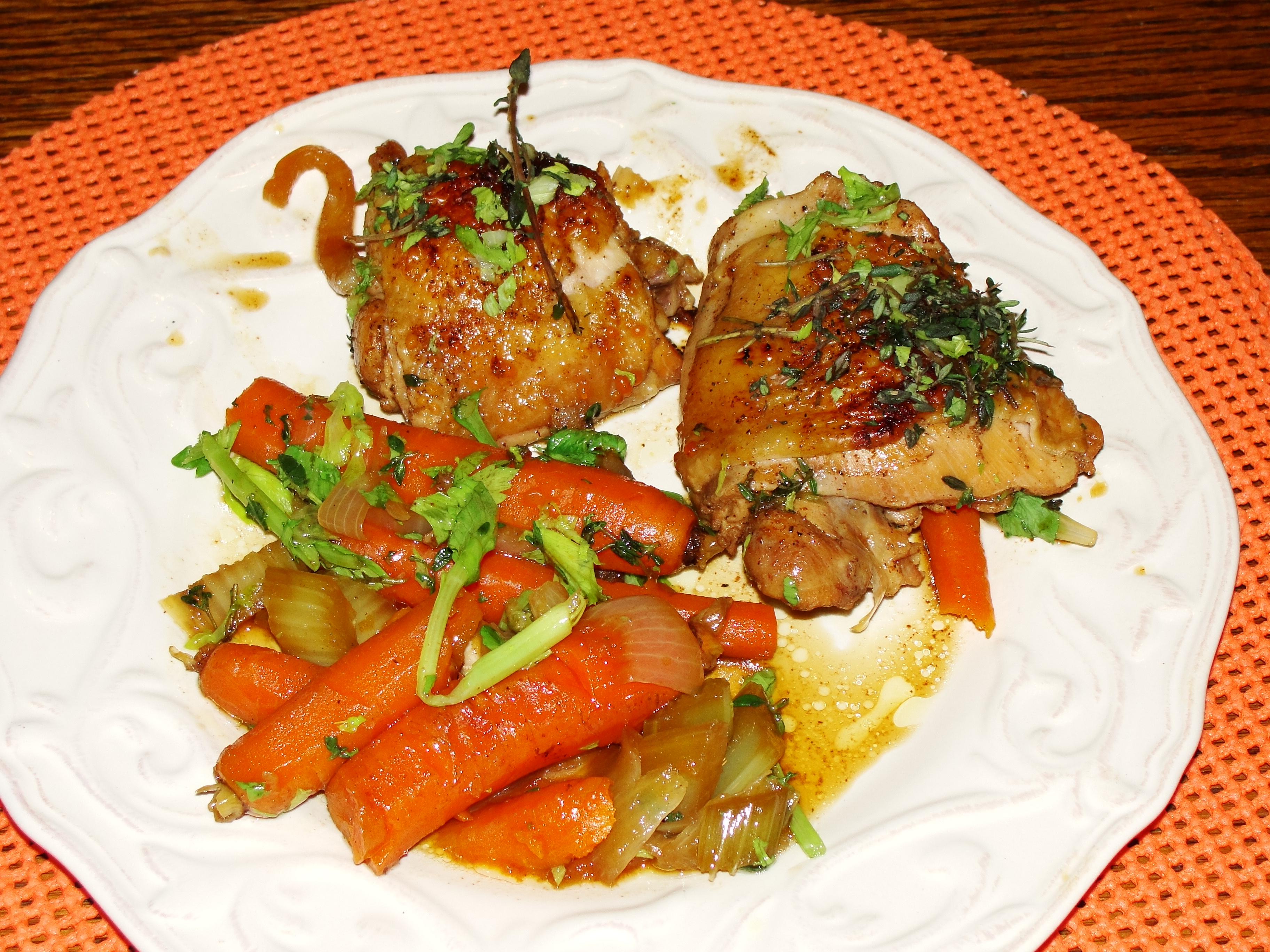 In a large oven proof skillet brown chicken until skin is crispy. Remove chicken, drain fat reserving about 2 tbsp.