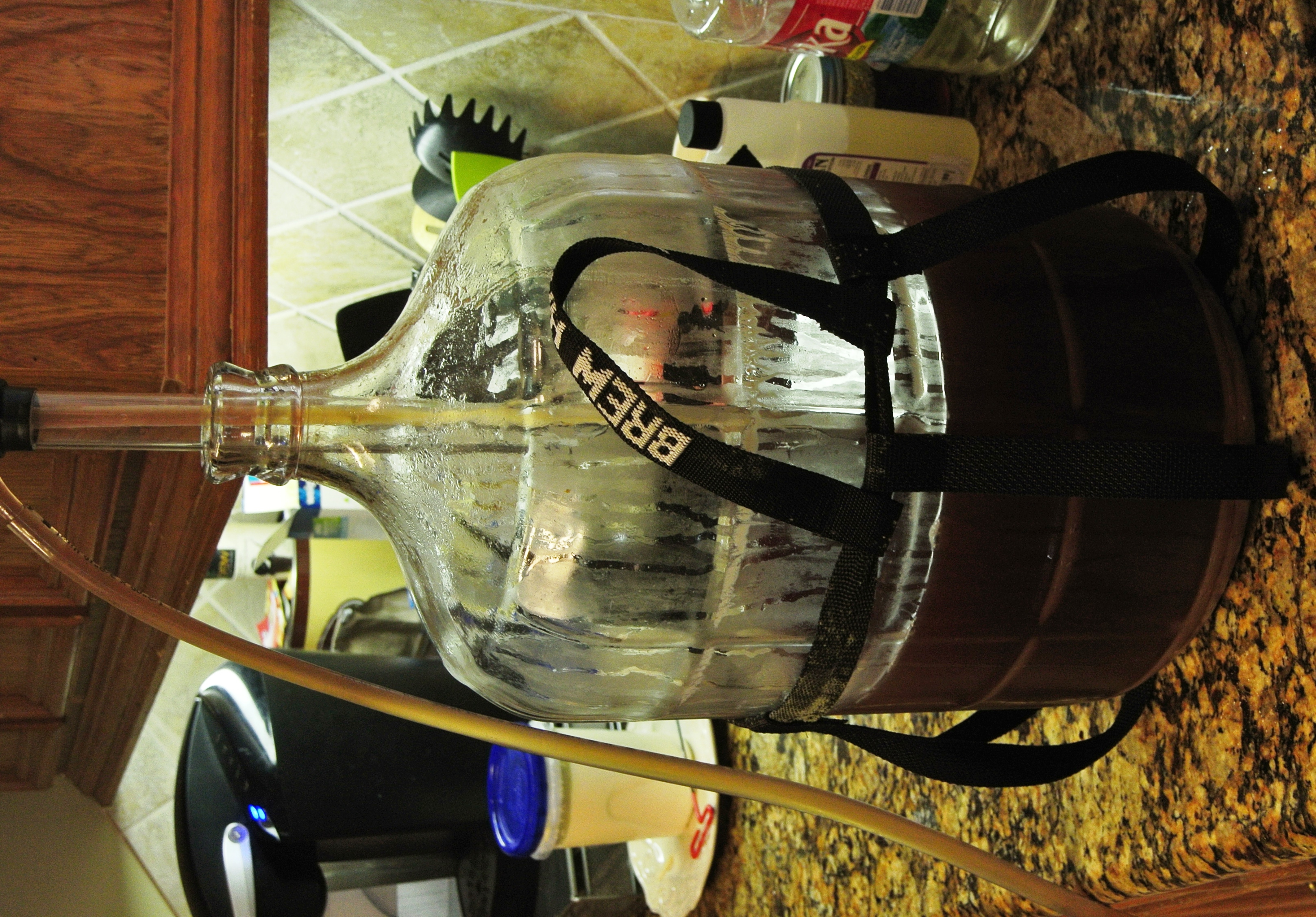 The transfer is on…Sourdough starter in the left background. I love the carboy carrier straps…makes it easier and less likely to drop it.