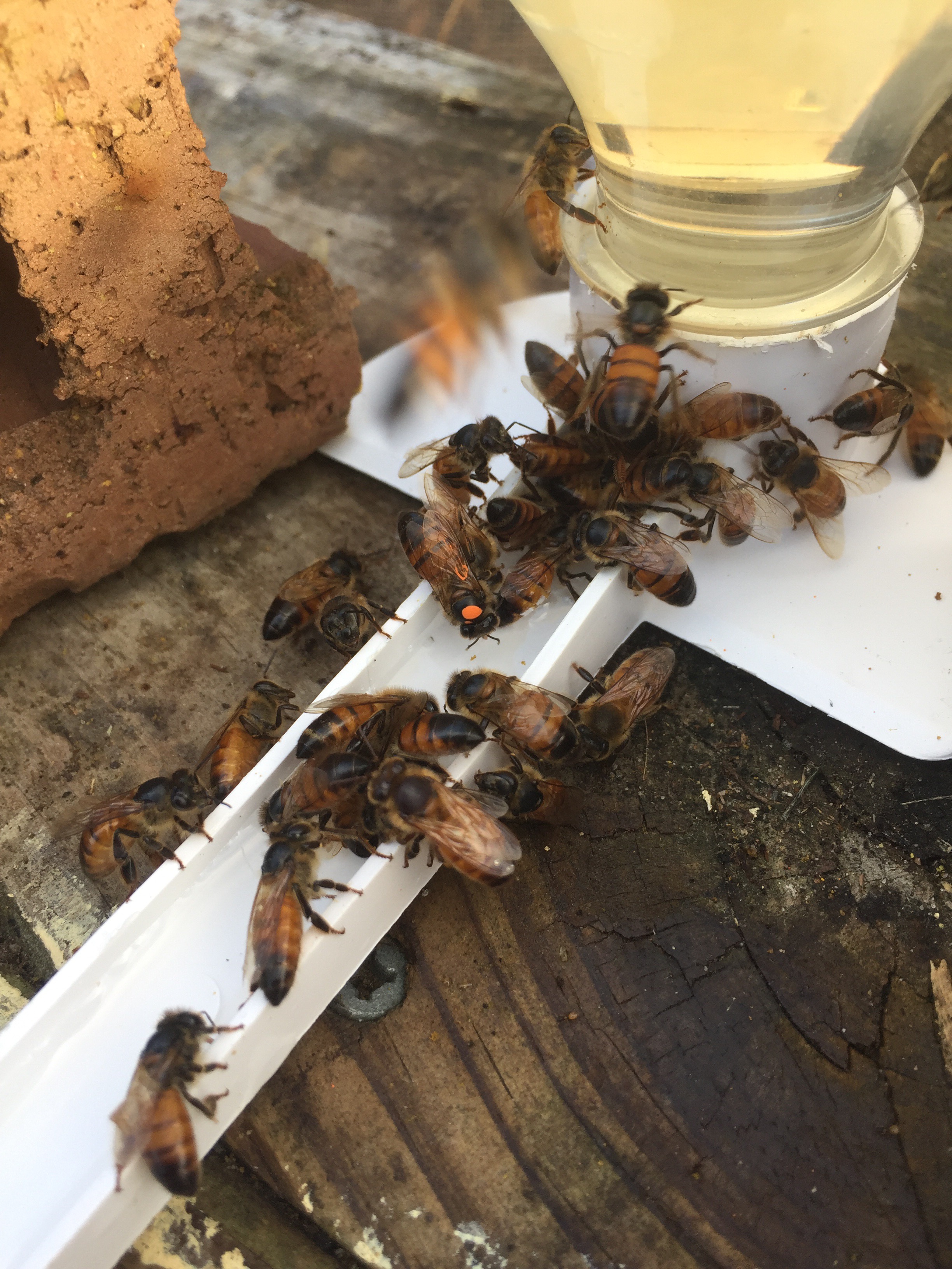 I went out with a fresh bottle of sugar water early this morning,  before the bees were up and out foraging. Then I waited. Once a few visitors showed up I marked one with a dot of orange paint.