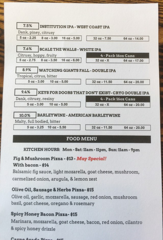 I went big on my first beer with the Vacancy IPA. Poured with a perfect head and the aroma was very pleasant. Kathy went with the Mango Day Dreamin and she enjoyed it.