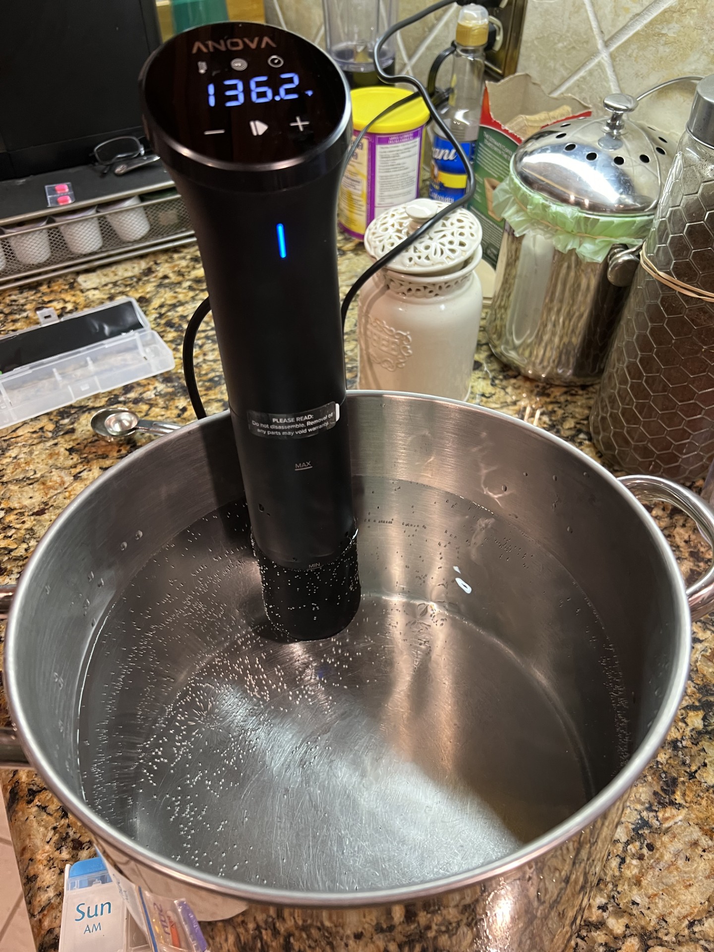 Additional experimentation and exploration, I am a bit notorious with my need to experiment and explore. The drawback is that repeatability when a come across something really good may suffer. Note to self; make notes and capture the story. Used my sous vide to run the water temperature up to170 degrees F. Steeped for 30 minutes. Needed to use 1.5 gallons to get sous vide gear submerged enough to pump and heat….I had planned on 8 grams of Tahoma, bumped to 12 grams as the volume was half again larger. My prior pH discoveries let me zero in to pH 3.55 this time, just what I wanted. I filled one half of a 1/8 teaspoon with citric acid but then ;only added a little “dab”, measured pH, added another “dab”, measured pH, added another “dab”, measured and yee haw, pH dialed in to 3.55. Still a relatively large amount of citric acid was left in the measuring spoon.