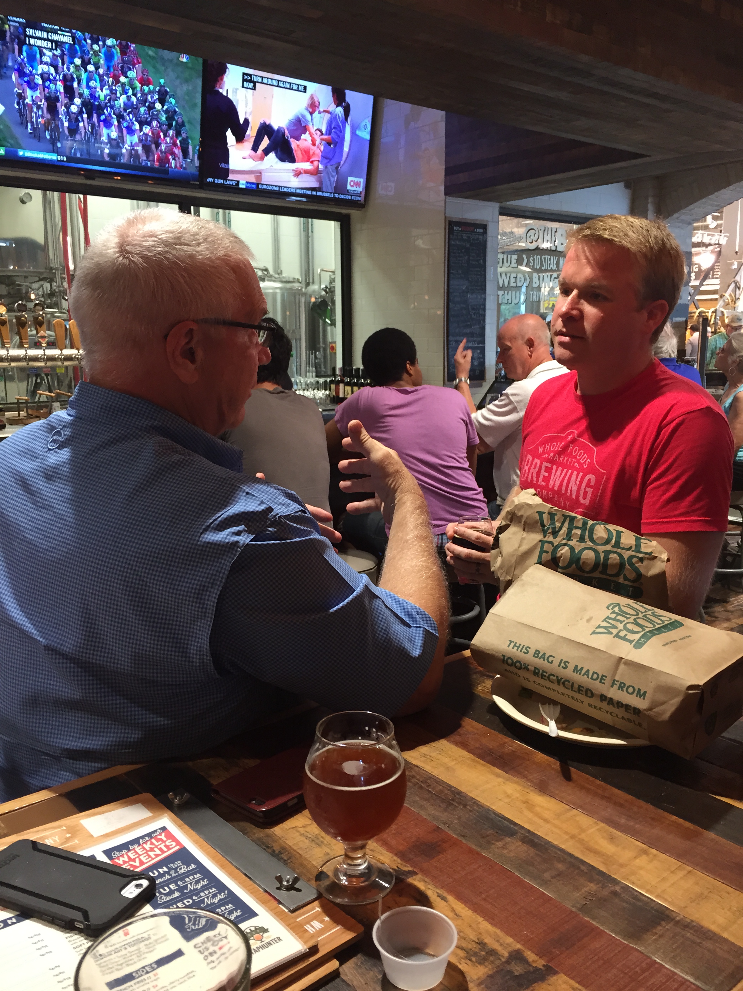Back to the Whole Foods story. We met for lunch, you can pick something up in the store and consume in the Brewery area or order off a menu. We did a mix of both. The day of our visit they had 12 house brewed beers on tap and a couple of guest beers. They variety and creativity is pretty amazing. A word to beer lovers, if you find one on the menu you like, carve out some time to continue drinking, come back often because once that batch is gone it will be only a memory!