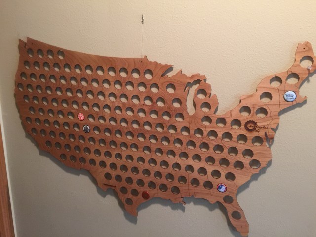 Not that I really need another reason but I have a very cool one now! For Christmas my daughters Lisa and Ashleigh gave me a US map with what appeared to be holes for quarters, 177 holes I found out later. Oops Dad, bad guess. It is designed to hold bottle caps. Now that is pretty awesome and as I pointed out, another good reason to drink GOOD BEER!